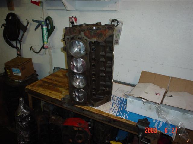 | I really like those wheels...the front really sits high without the engine | stripped and cleaned the original block. new pistons just hand placed for effect | looks like everything is nearly ready for new engine and tranny |